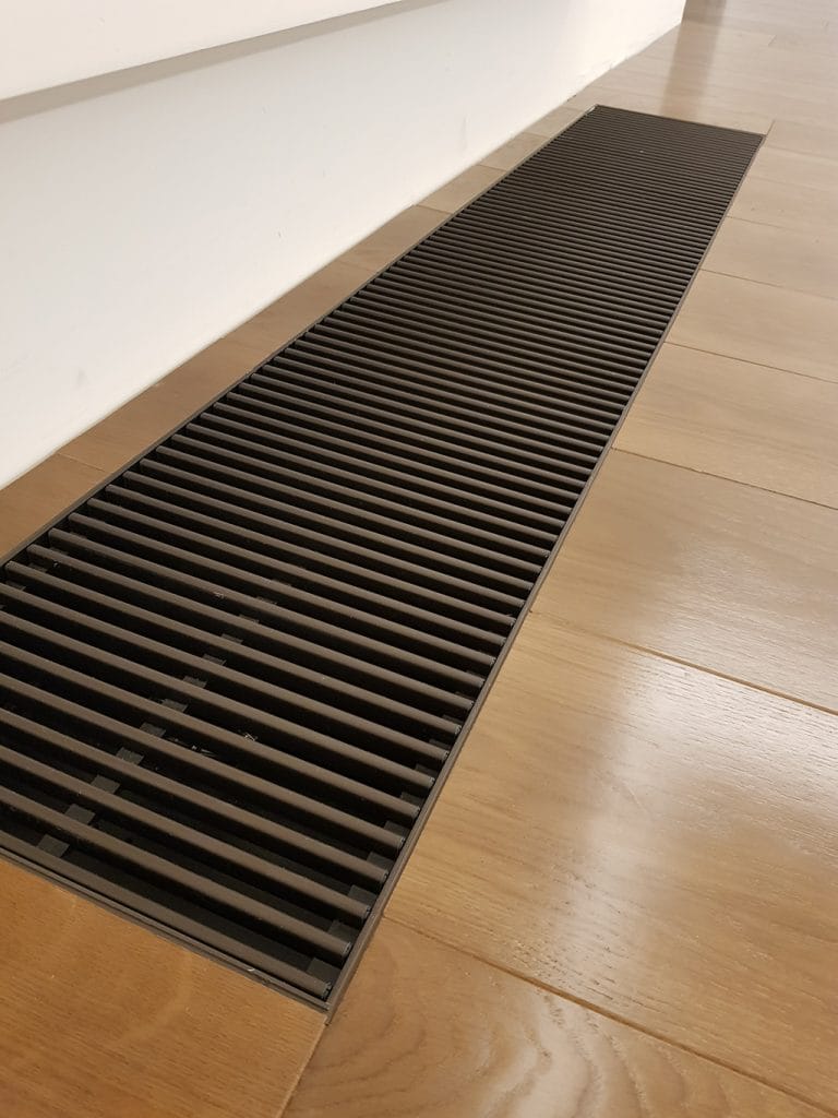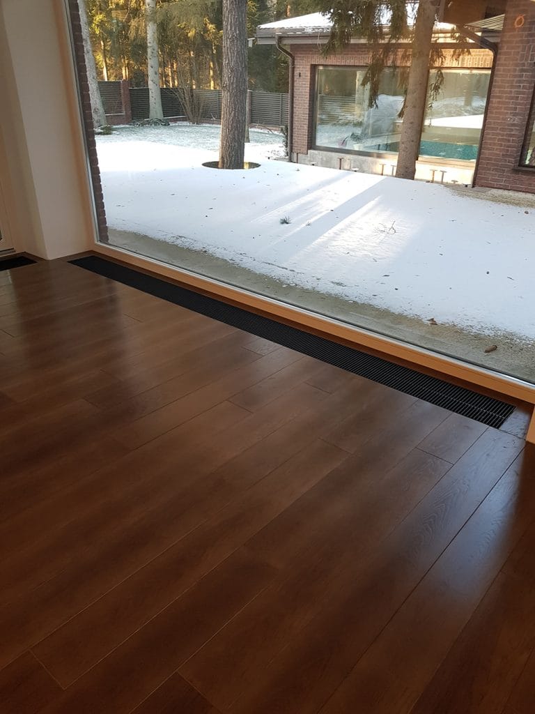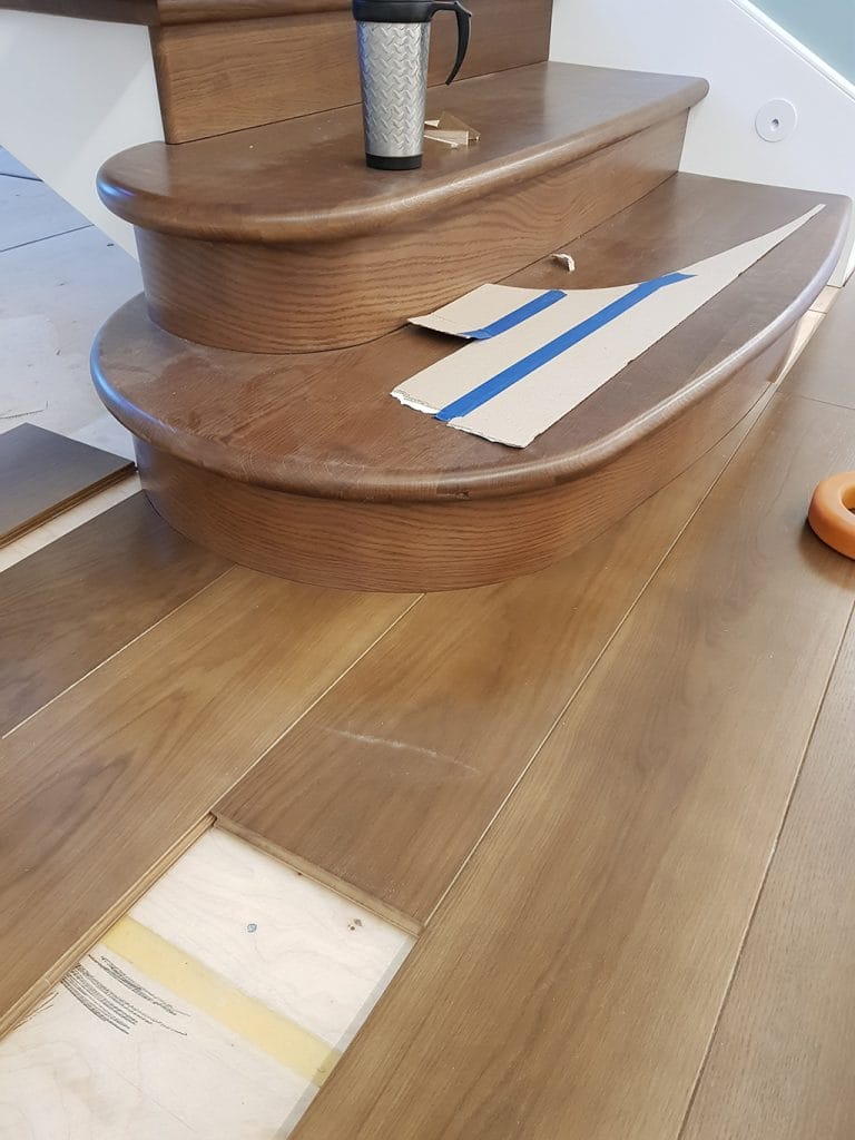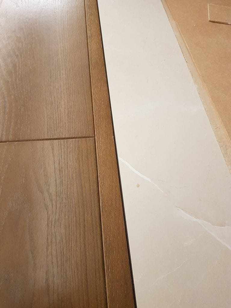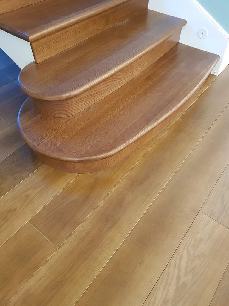 Укладка производилась на предварительно смонтированную и отшлифованную фанеру. Фанера укладывалась для того, чтобы поднять полы к уровню уложенной плитки. В процессе укладки была сделана точная подрезка к уже установленной лестнице, а также были оформлены стыки с конвекторами и плиткой через герметик.