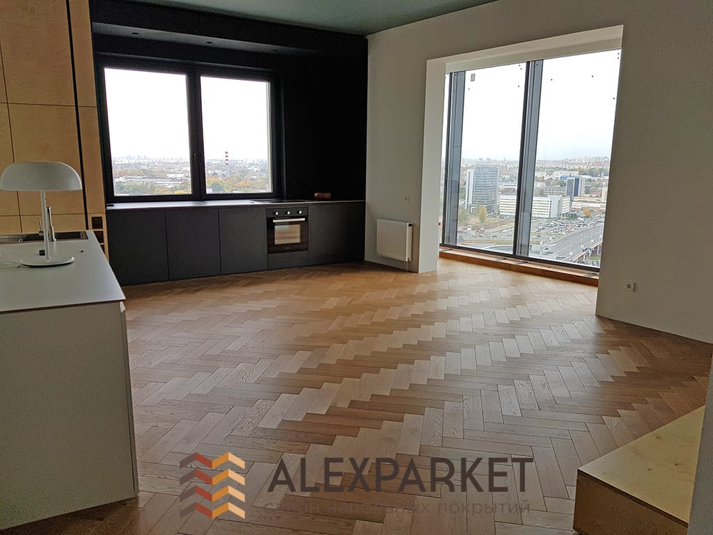 На данном проекте укладка паркетной доски была произведена на фанерное основание, чтобы поднять уровень паркета до уровня ранее уложенной плитки в санузле.